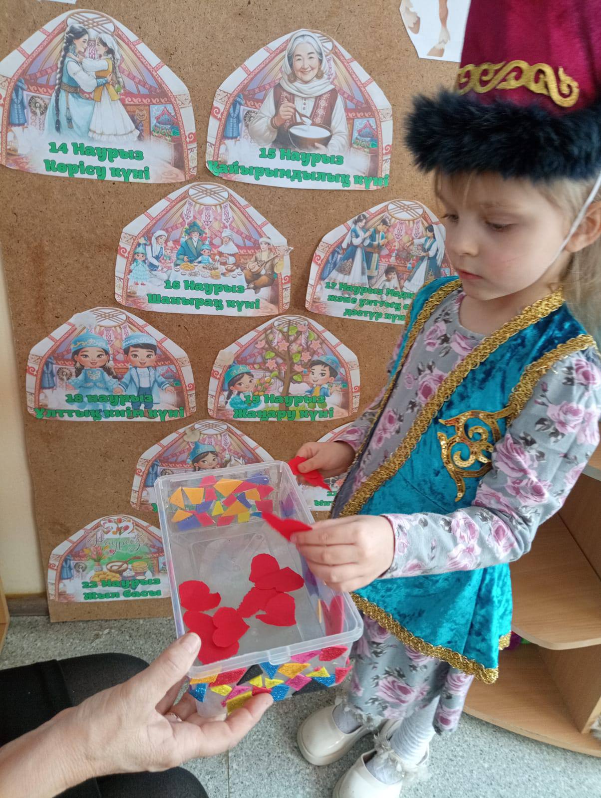 Второй день в нашей дошкольном учреждении прошел под название "Қайырымдылық күні" - "День добрых дел". Воспитатели рассказала, что в этот день люди стараются помогать друг другу и делать хорошие поступки. Дети говорили добрые слова: " Наурыз қутты болсын!", "Рахмет!", " жақсылық жаса".