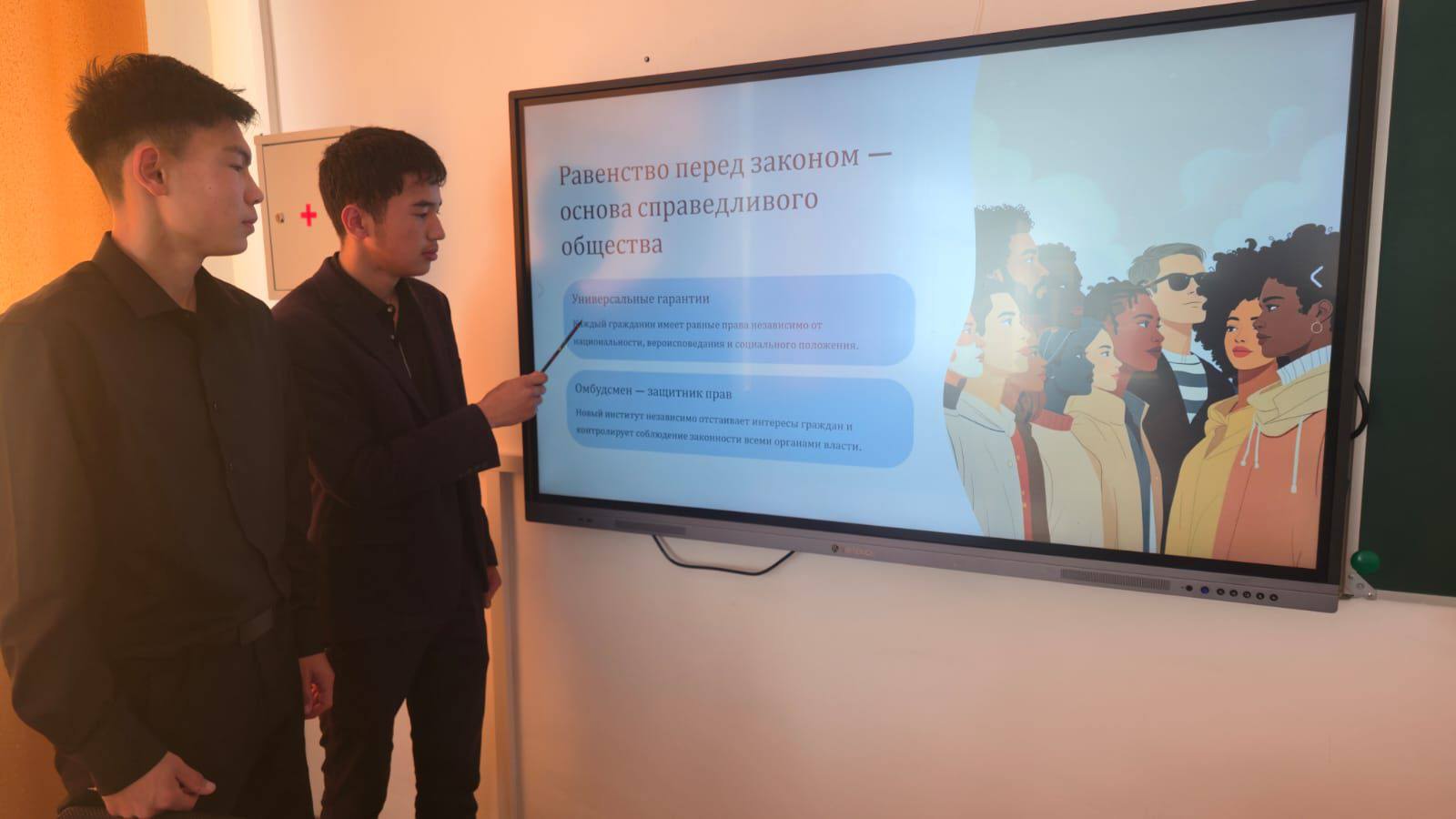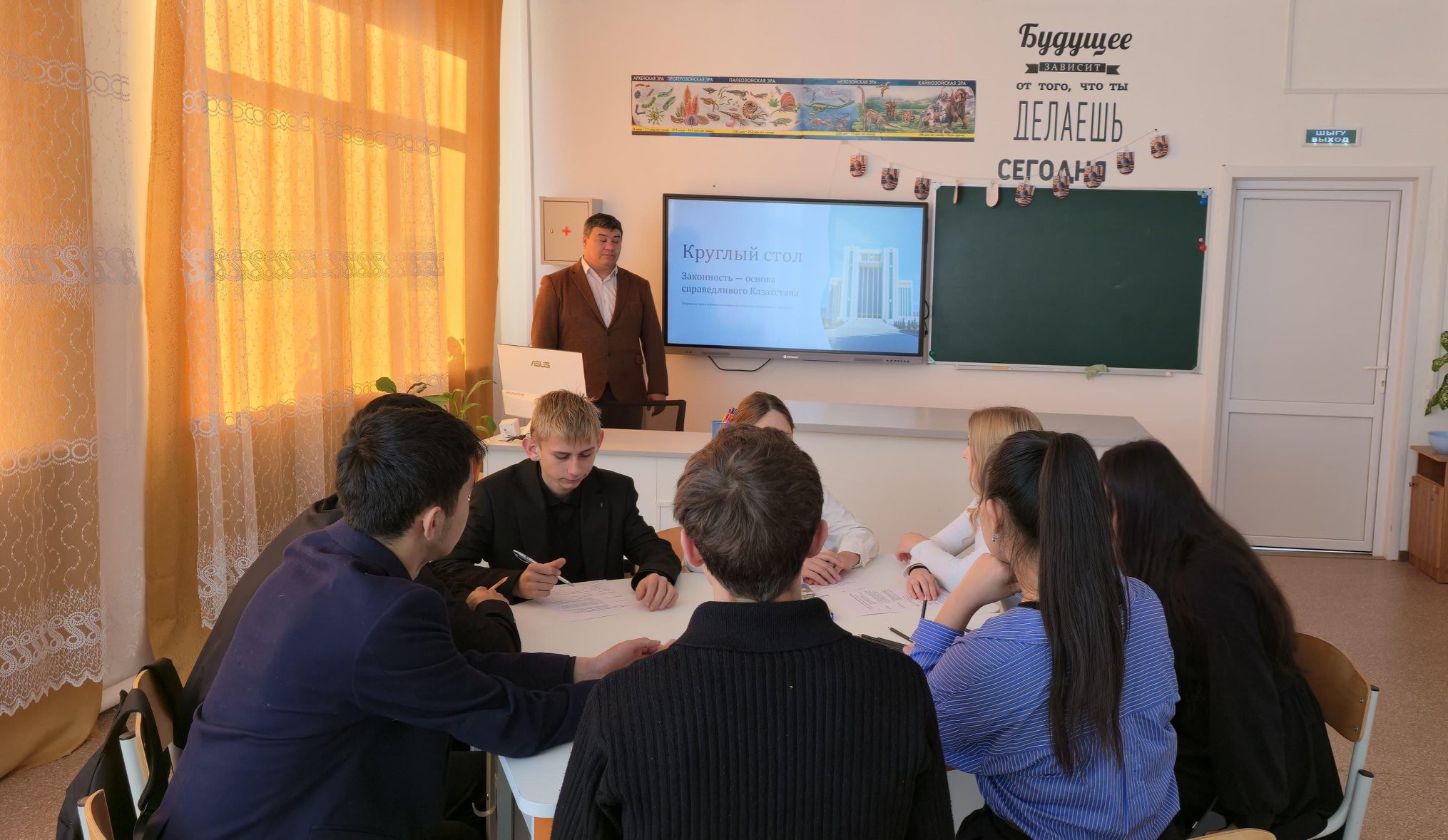 В честь празднования Дня Республики Казахстан в нашей школе учитель истории Базарбаев Азамат Калымжанович провёл круглый стол с учащимися 10–11 классов на тему «Заң үстемдігі – әділетті Қазақстанның негізі».